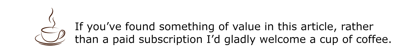 And please consider becoming a paid subscriber. Doing so supports my writing efforts and grants me the most precious of all resources - dedicated time for writing. And for that, I am deeply grateful. If you prefer, buy me a cup of coffee if there is an article here and there that you enjoyed or found valuable.