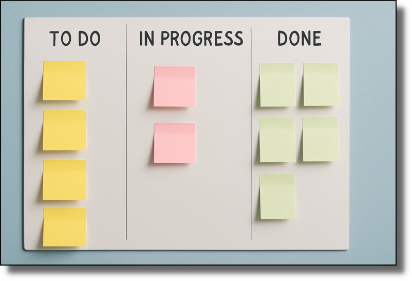 Formally speaking, a Kanban board is a project management tool. It's roots date back to post-WWII Japan where Taiichi Ohno, an industrial engineer working at Toyota, develop a system for tracking and implementing production improvements. The system, "Kanban" (meaning "signboard"), uses a collection of organized cards to track workflows. It has since been adapted to a wide variety of industries. I learned how to use Kanban boards for software development and continue to use them for just about any medium or long term project - home maintenance and improvements, writing projects, software projects, and health issues.